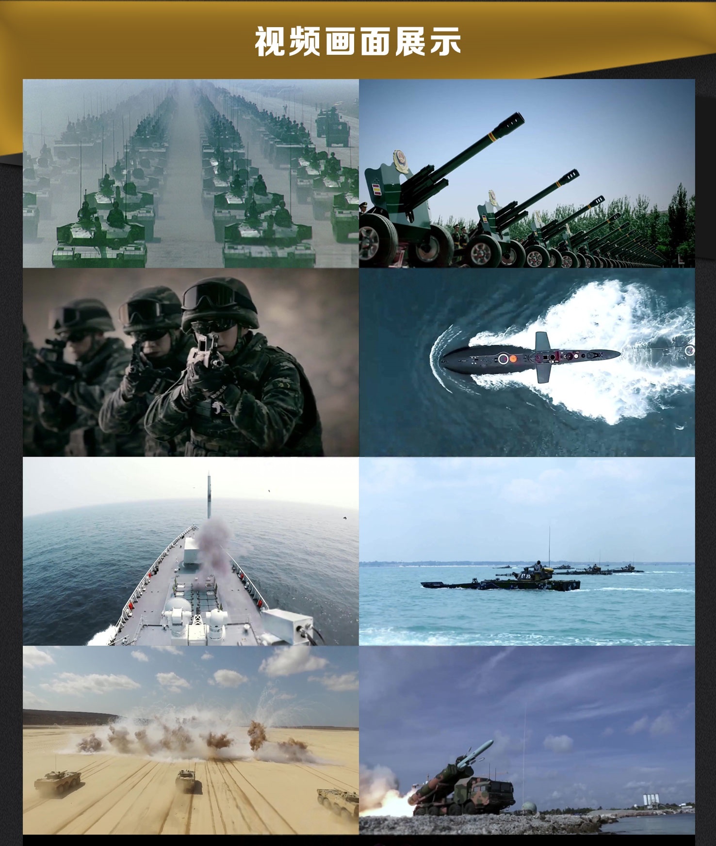 视频素材总数量:47款 每款视频素材时长:几秒钟到几分钟左右不等 视频素材画质:最清晰版本 视频素材格式:MP4 无水印 视频素材适用领域:军事 【47款】中国军队军人演习训练海陆空军部队航母国防阅兵装备军事视频素材部分视频素材截图预览: